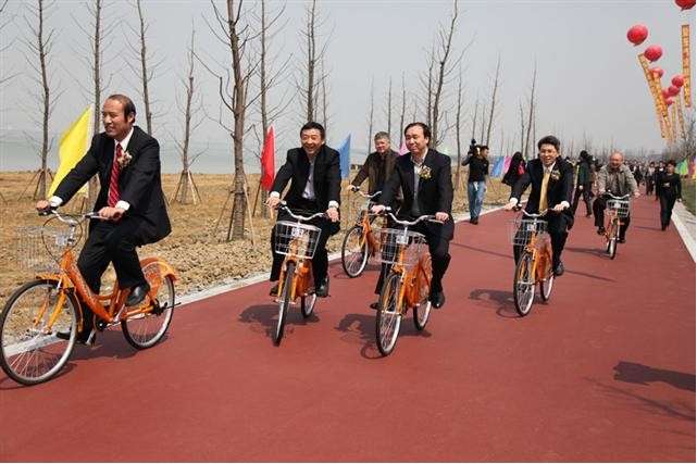 2012年3月26日,環(huán)太湖風(fēng)景路建設(shè)啟動(dòng)儀式在吳江市與浙江省湖州市吳興區(qū)交界處舉行,參加啟動(dòng)儀式的國(guó)家住建部總工程師陳重、江蘇省副省長(zhǎng)何權(quán)、浙江省副省長(zhǎng)陳加元等領(lǐng)導(dǎo)在蘇州市副市長(zhǎng)吳江市委書(shū)記徐明、吳江市代市長(zhǎng)梁一波的陪同下,到吳江濱湖新城生態(tài)公園體驗(yàn)公共自行車。